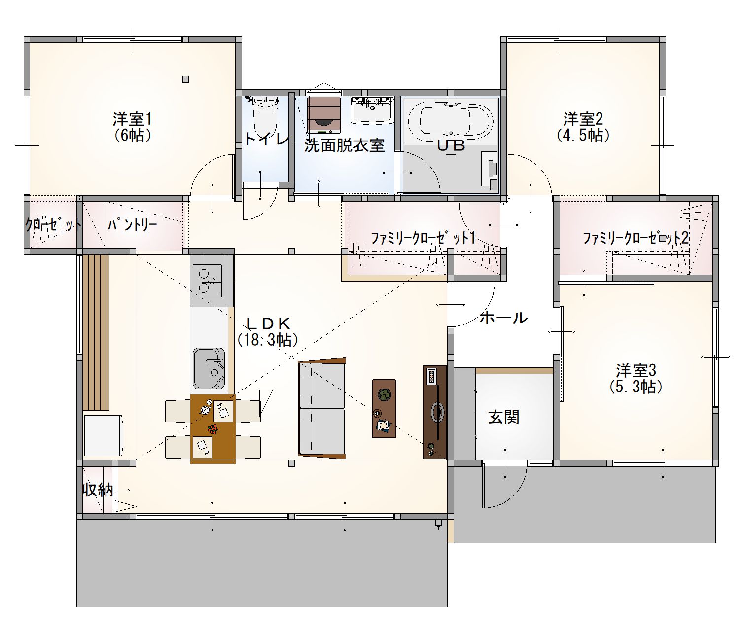 回遊動線が取れたアイランドキッチンとファミリークローゼット、パントリーがついた