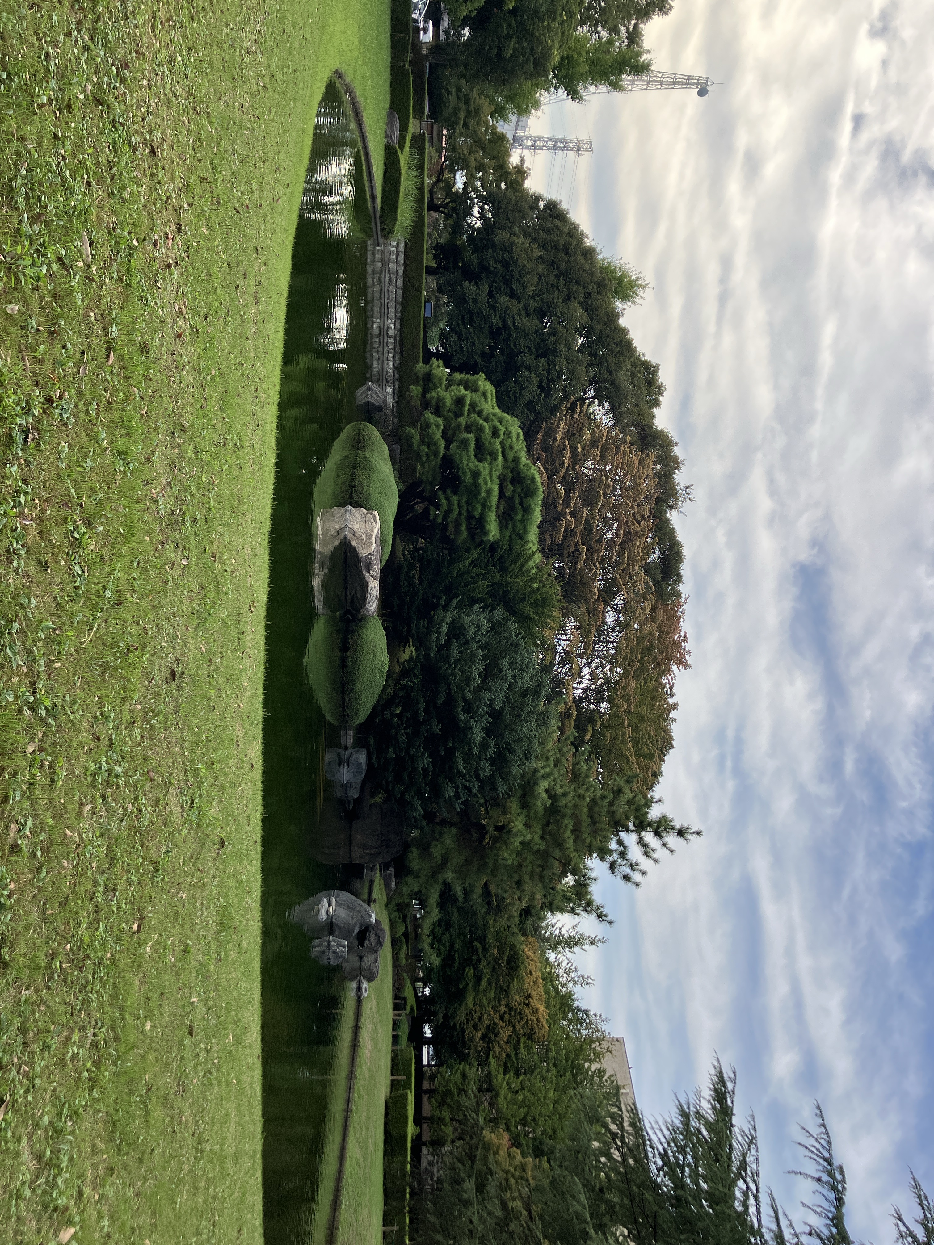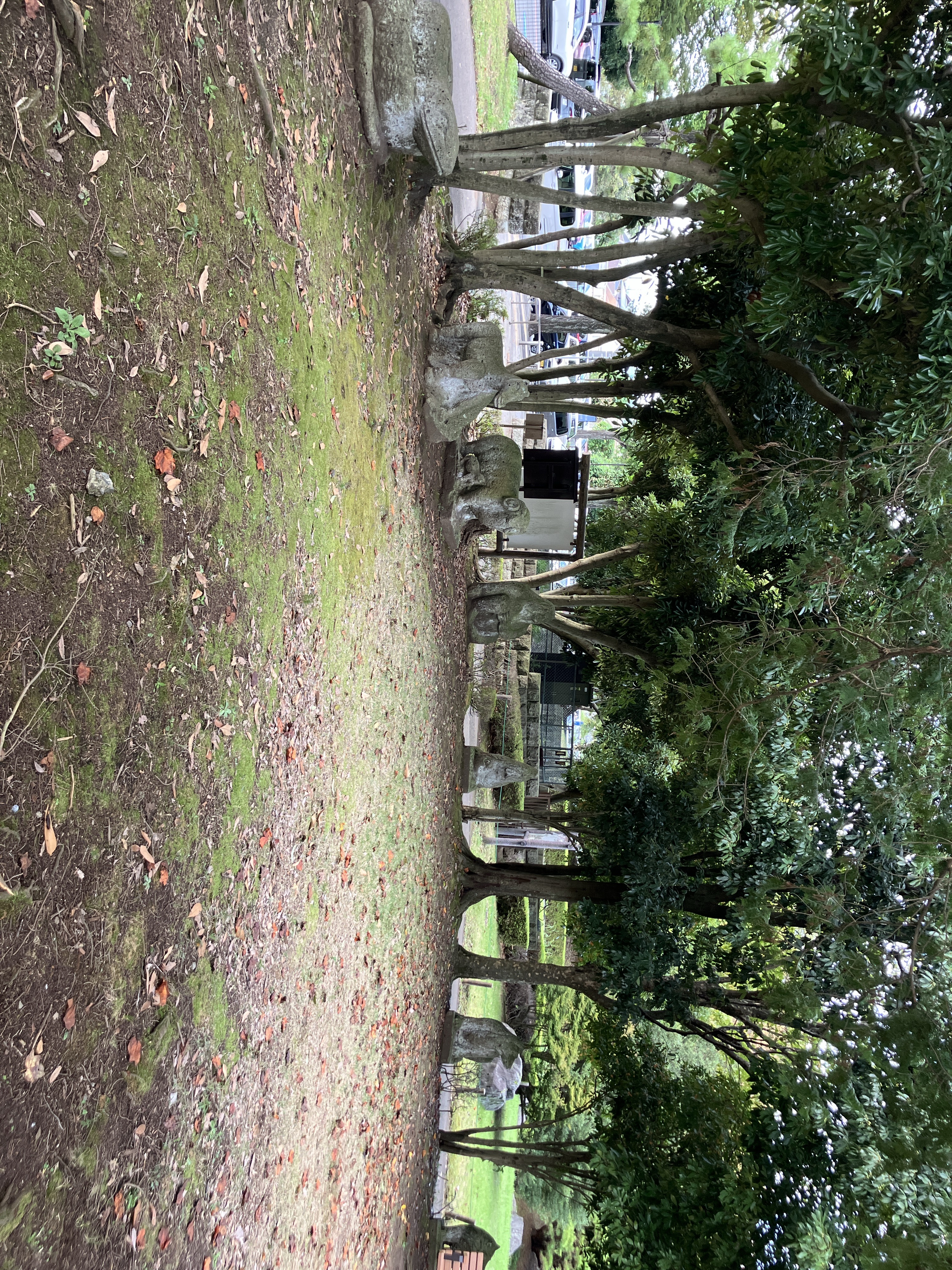 綺麗で池もあって緑と自然の木々との調和が良く、動物の石像