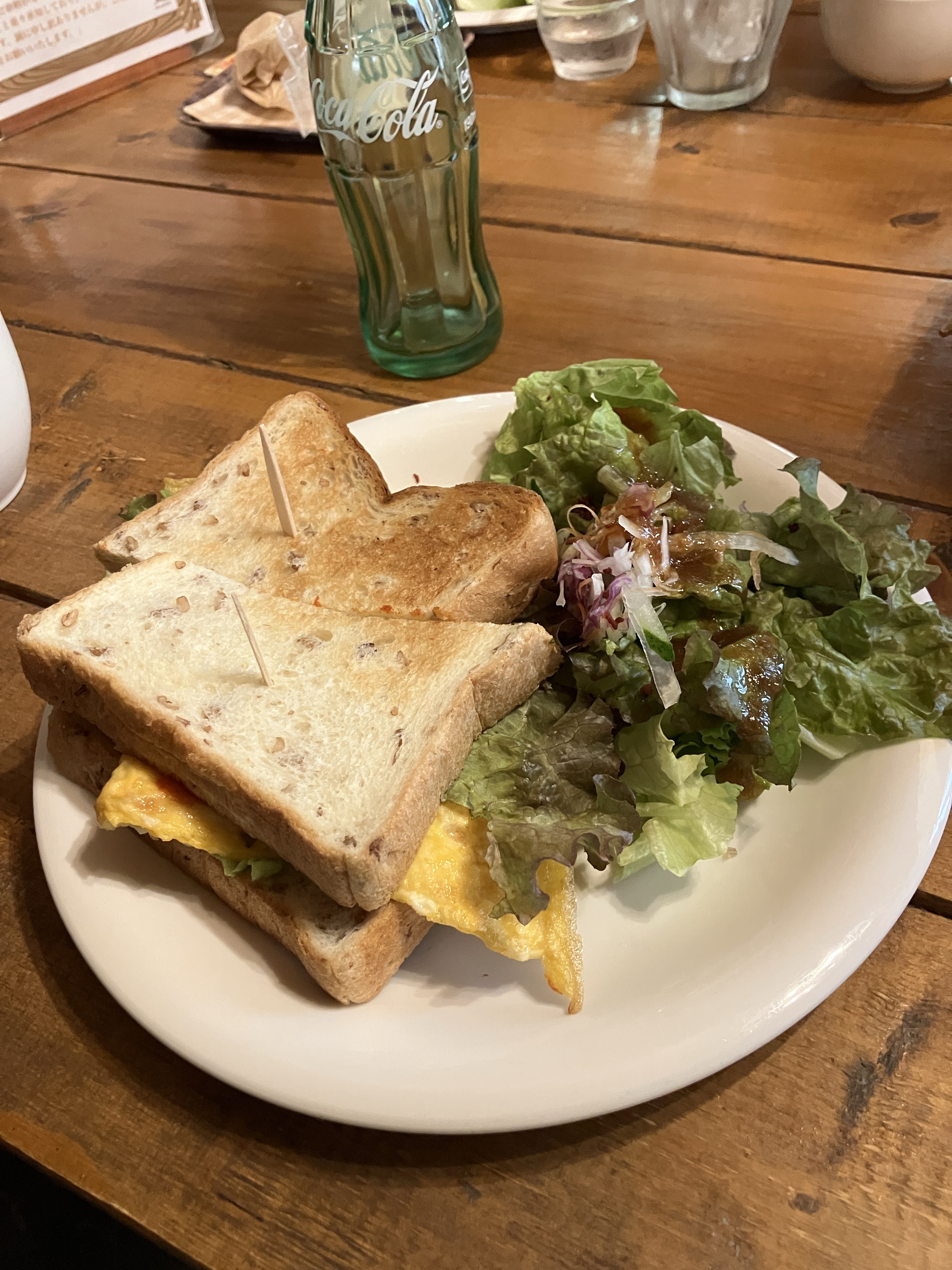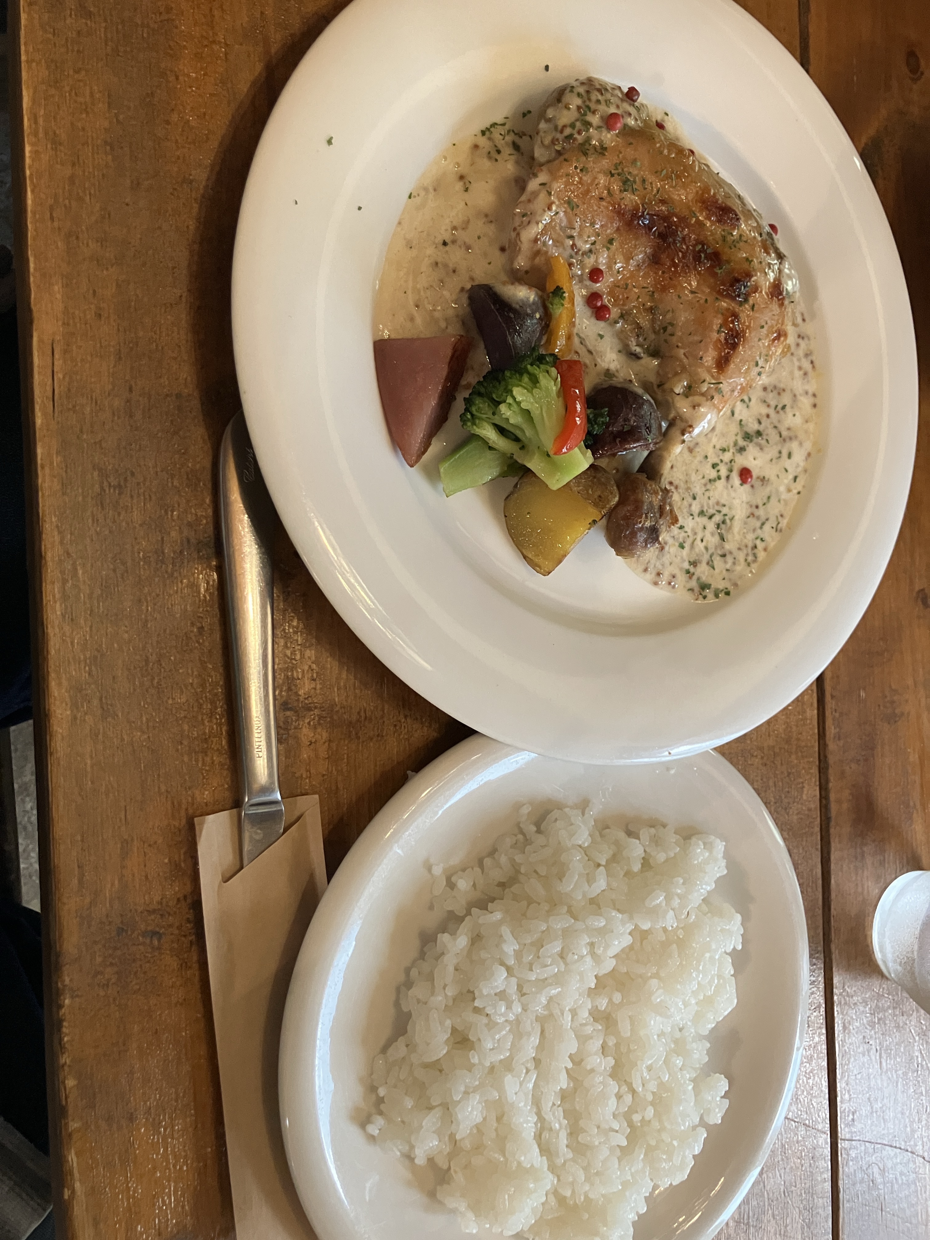 店内はどこか素朴で温かい雰囲気。テーブルには採れたて野菜を使ったサラダや、こんがりと焼けたサンドイッチ、クリーミーなソースがたっぷりかかったチキンが並び、見た目から食欲をそそられます。