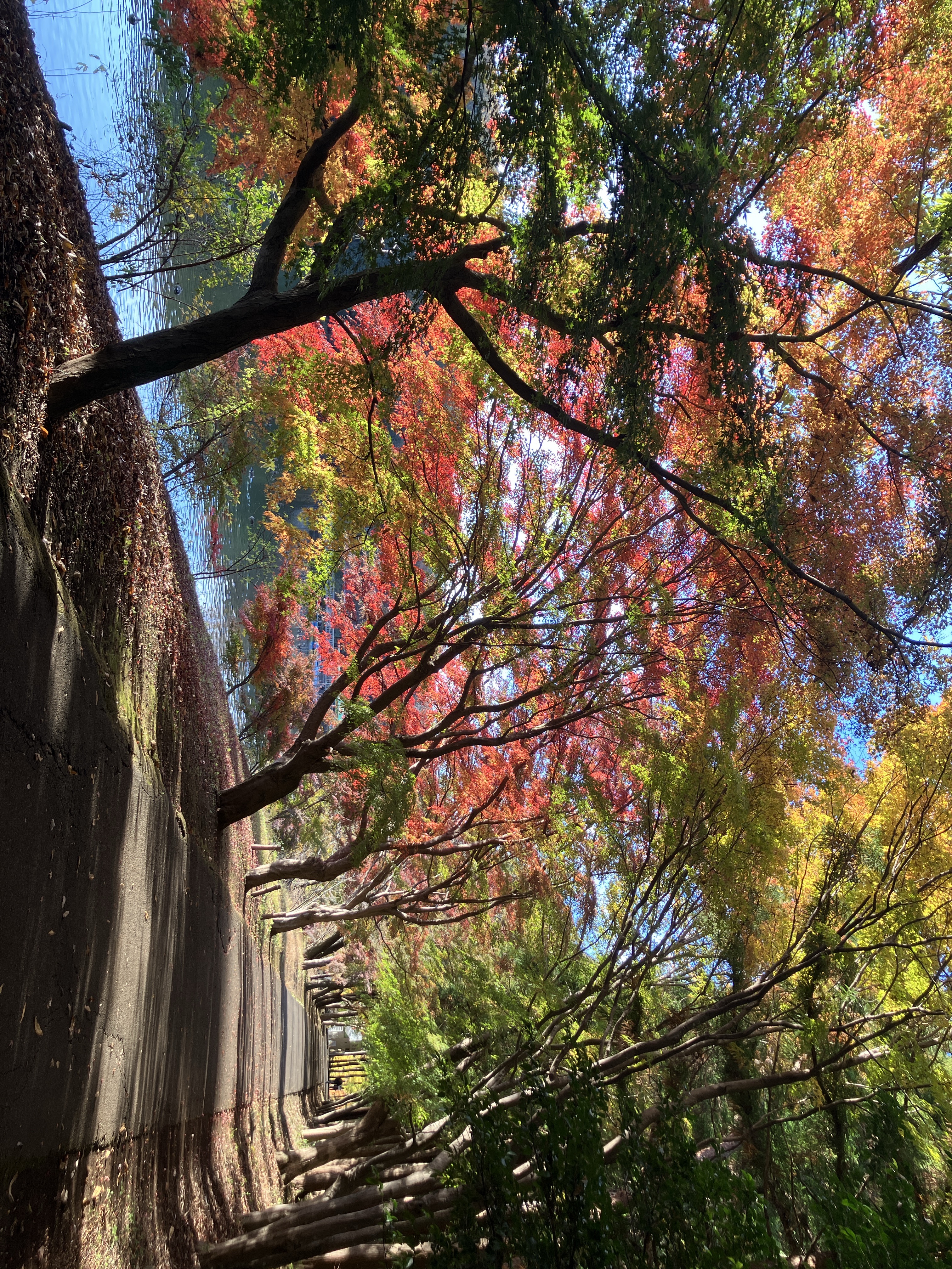 秋晴れで木漏れ日とのコントラストがきれいな紅葉を眺めながら
