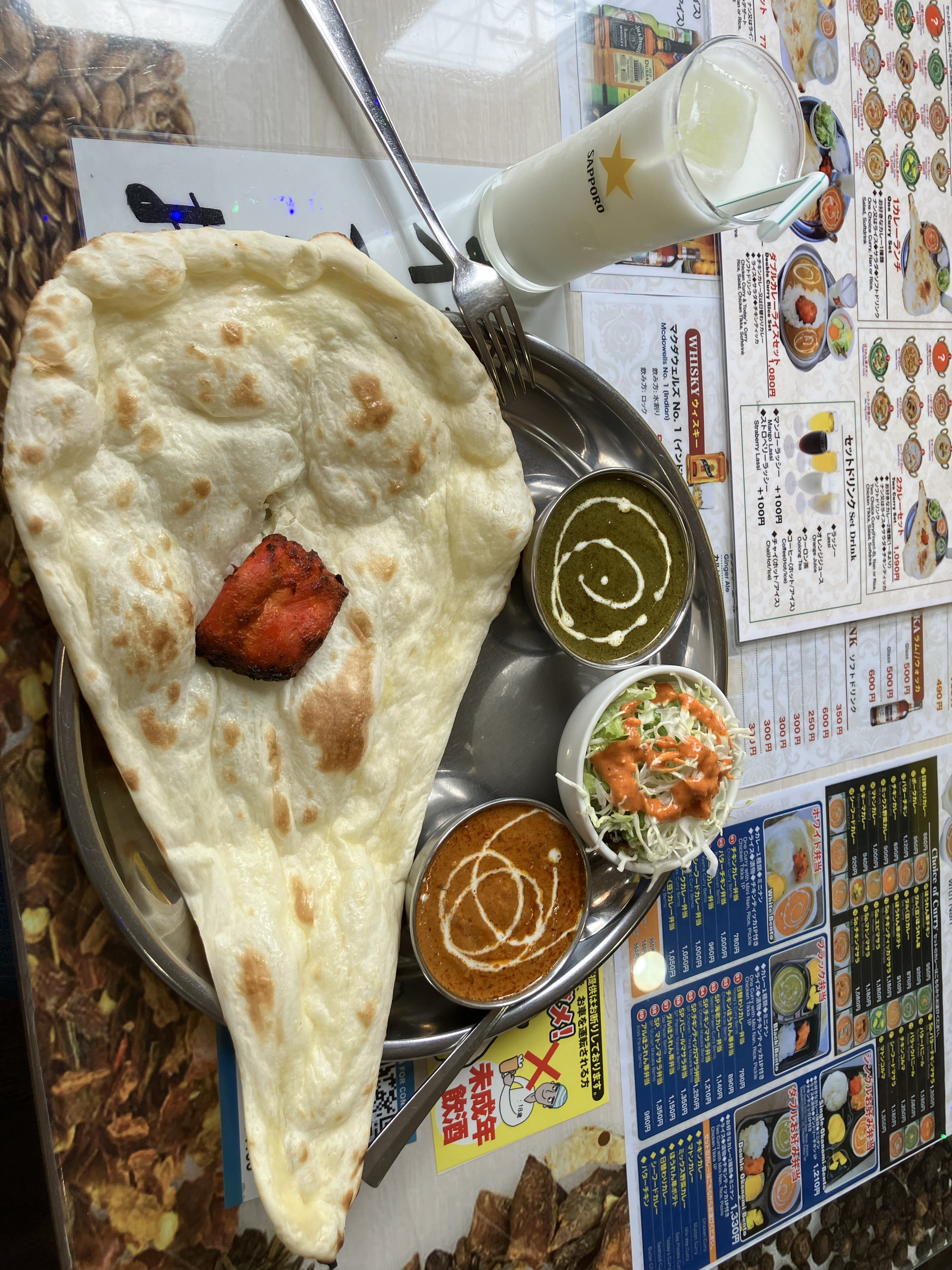好きなカレー2種類とサラダにチキン、ラッシーもついて