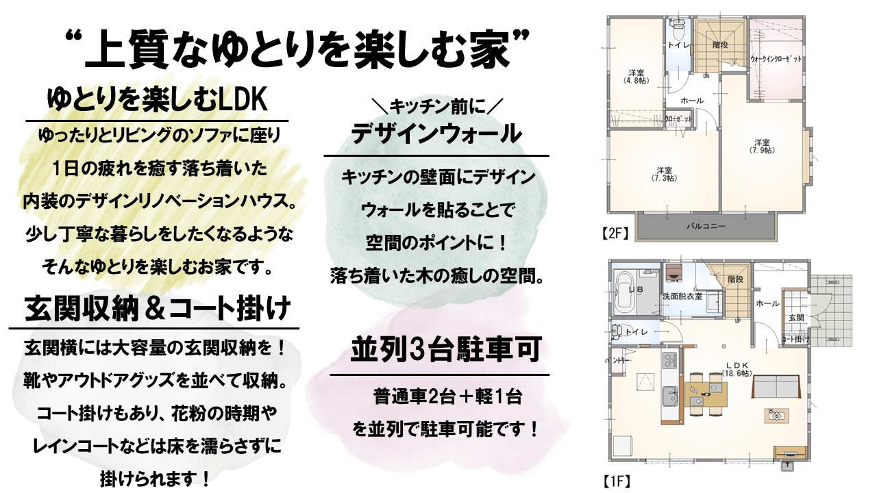 大人気の鶴田エリアにデザインリノベーションハウスが登場!玄関を入ると大容量の靴収納とコート掛けを設置。リビングは日当たりもよく、キッチン壁に貼ったデザインウォールの木のあたたかみで毎日のお家時間を癒しの時間にしてくれます。