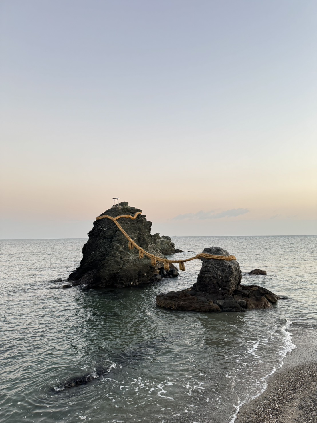 心も体も清めました!夫婦岩(めおといわ)の前で記念撮影