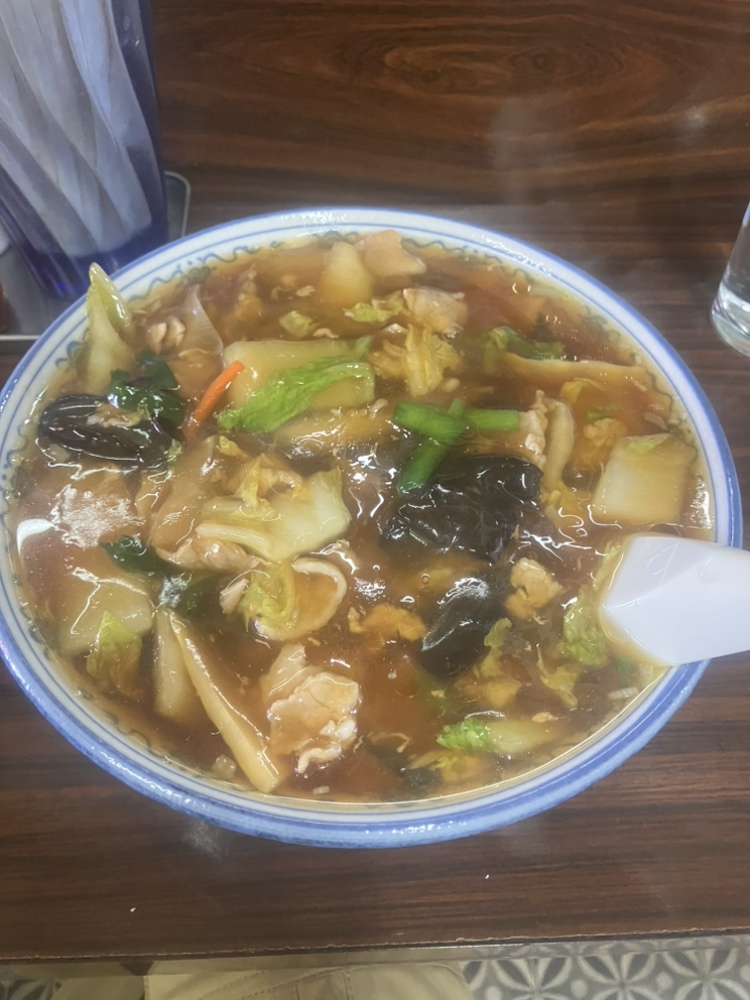 甘味の効いた醬油ベーススープに、さらに甘味の効いた熱々の五目あんかけを降り注いだ至福の一品