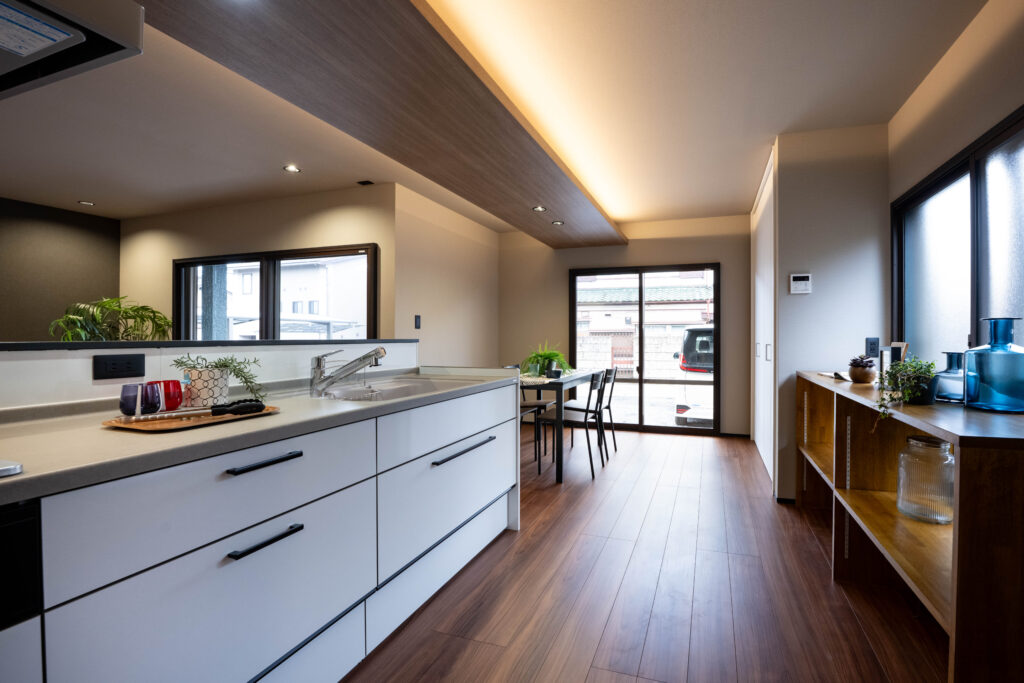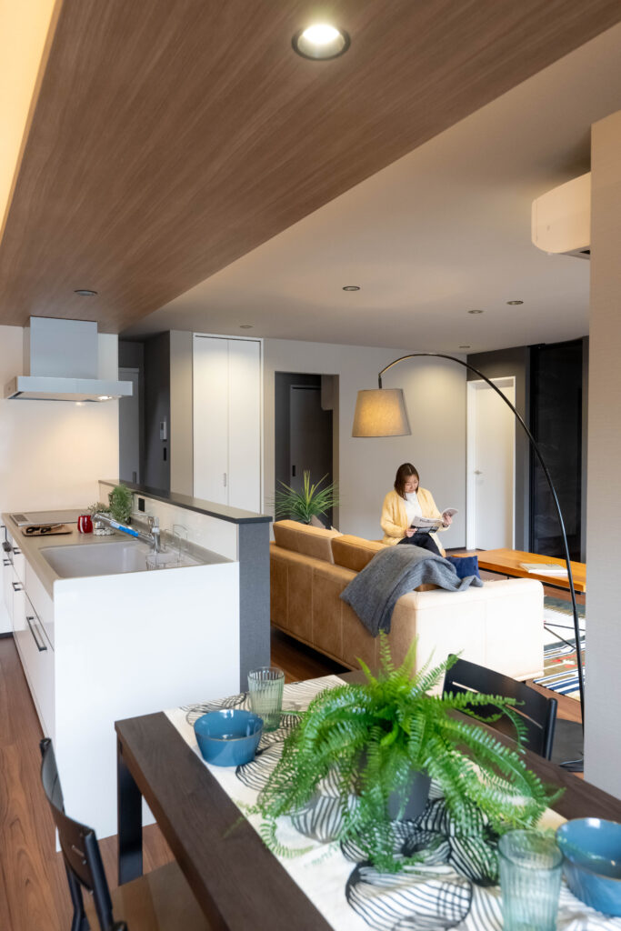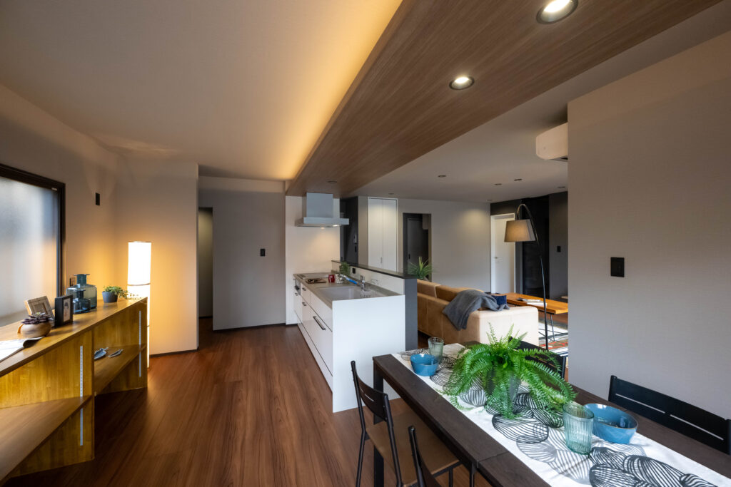 ダイニングキッチン上の間接照明は下がり天井になっており、まるでホテルに泊まりにきたかのような上質な内装に。
