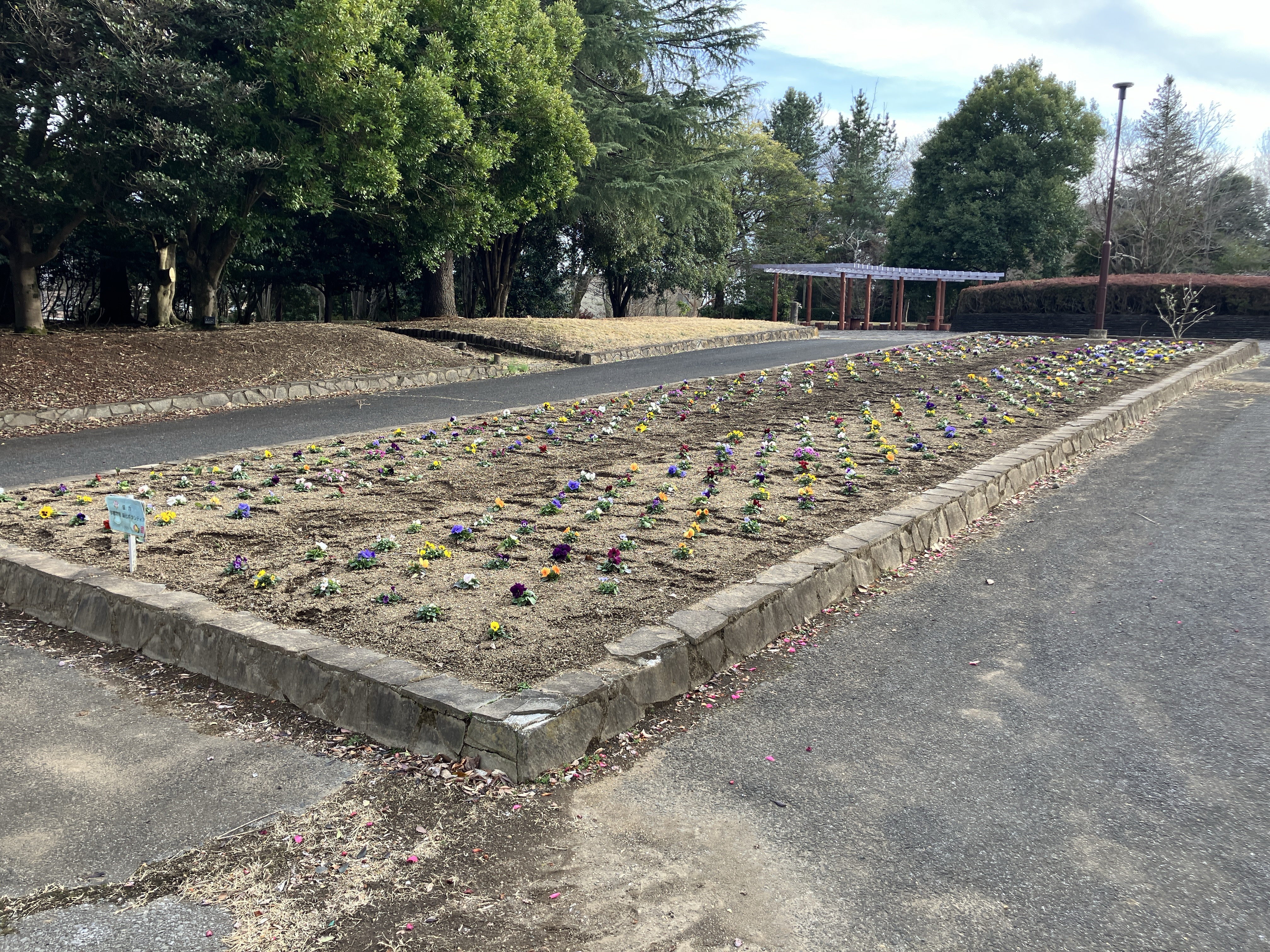 花壇の色鮮やかに咲く花や、白色の梅の花、綺麗な紅色の