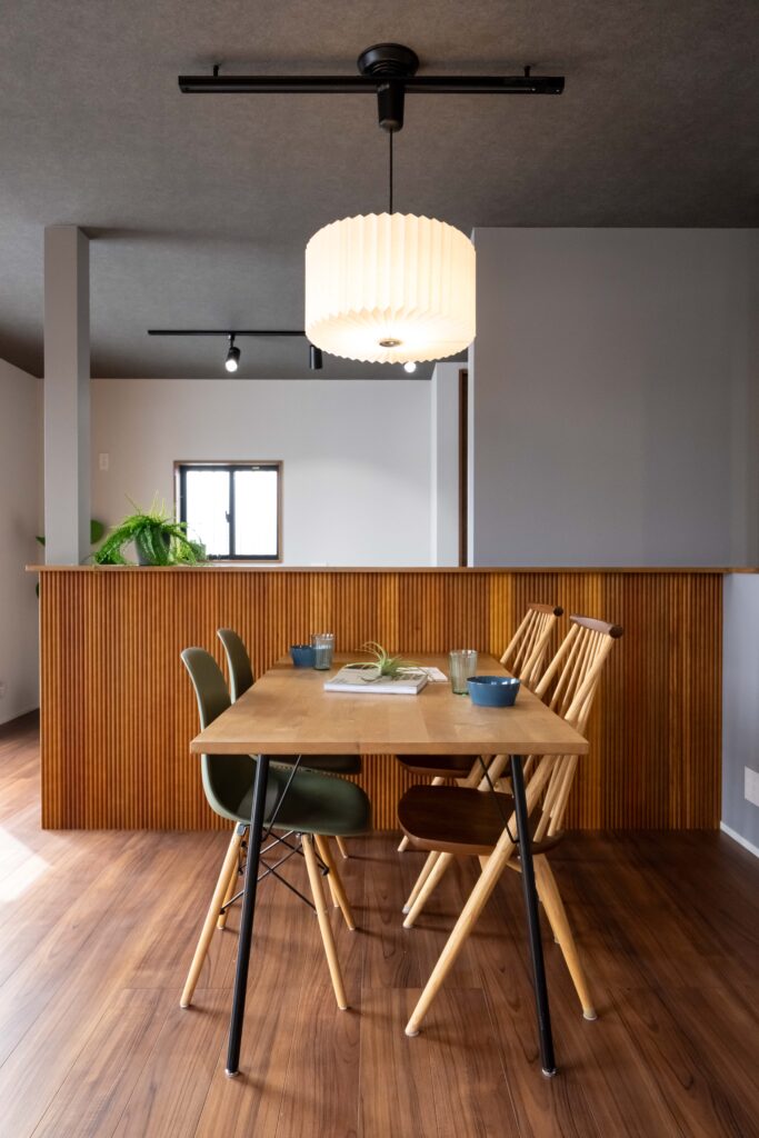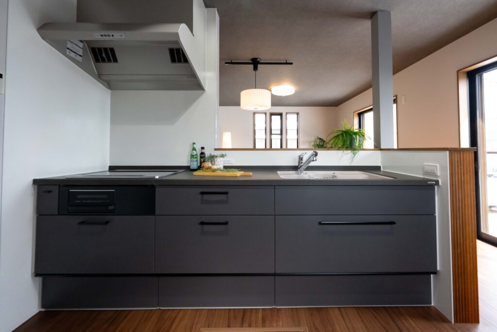 キッチンの壁面にデザインウォールを貼り落ち着いた高級感のある空間に。