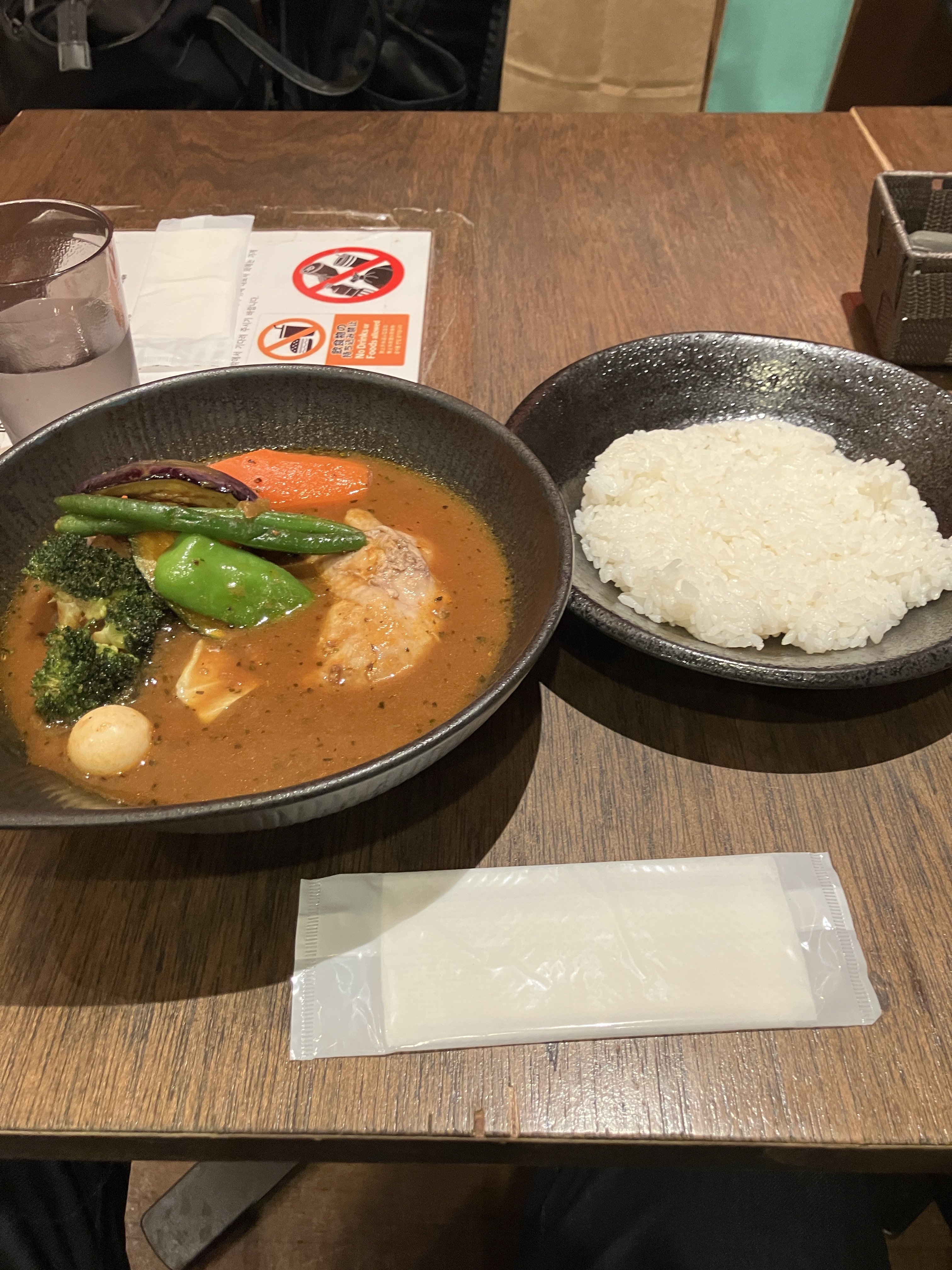 締めくくりは、野菜たっぷりのスープカレー。素揚げされたブロッコリーやピーマン、茄子など、素材本来の甘みがスパイシーなスープと見事に調和しています。ホロホロの鶏肉も絶品で、ライスが進む至福の一皿でした。