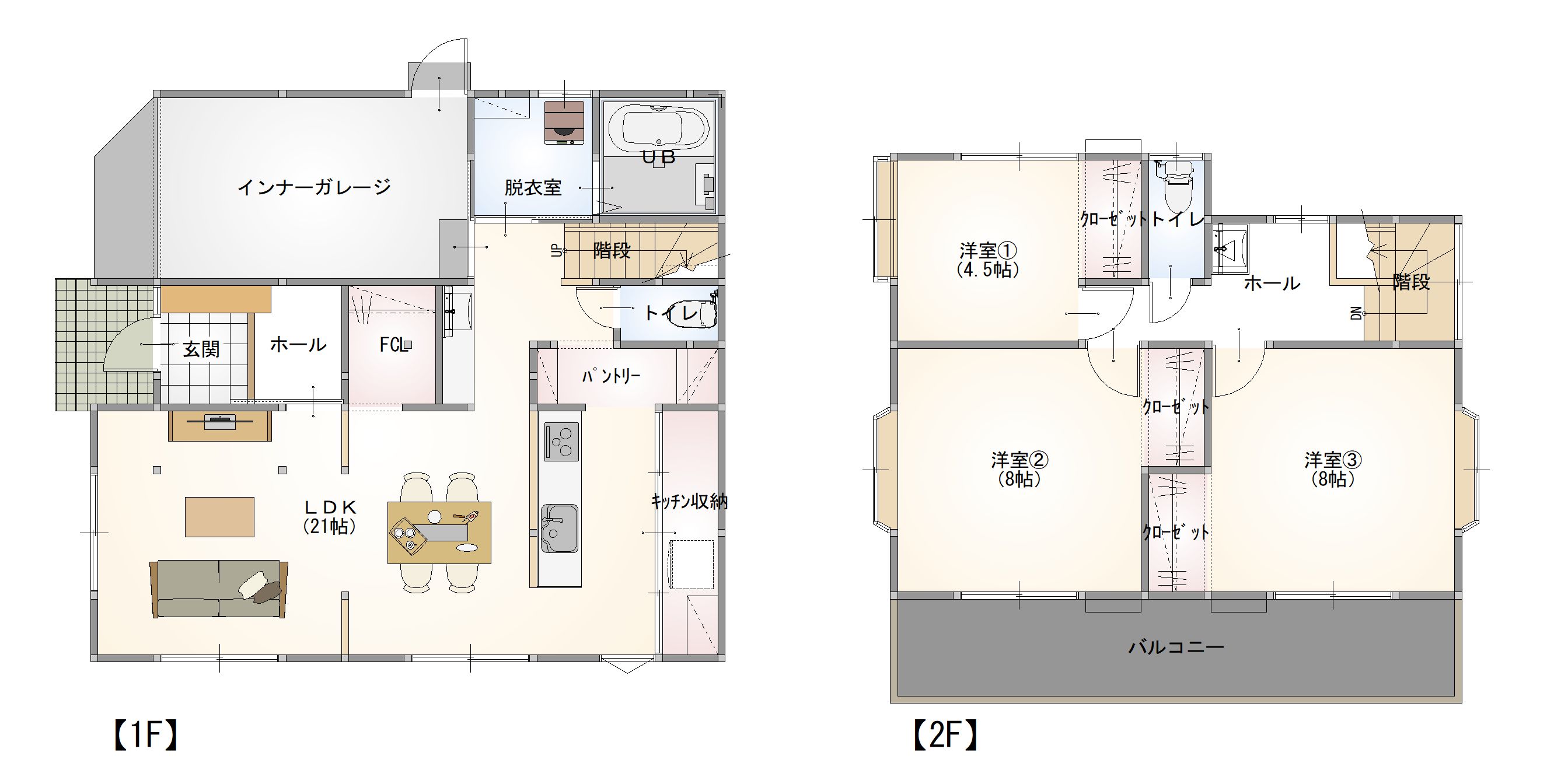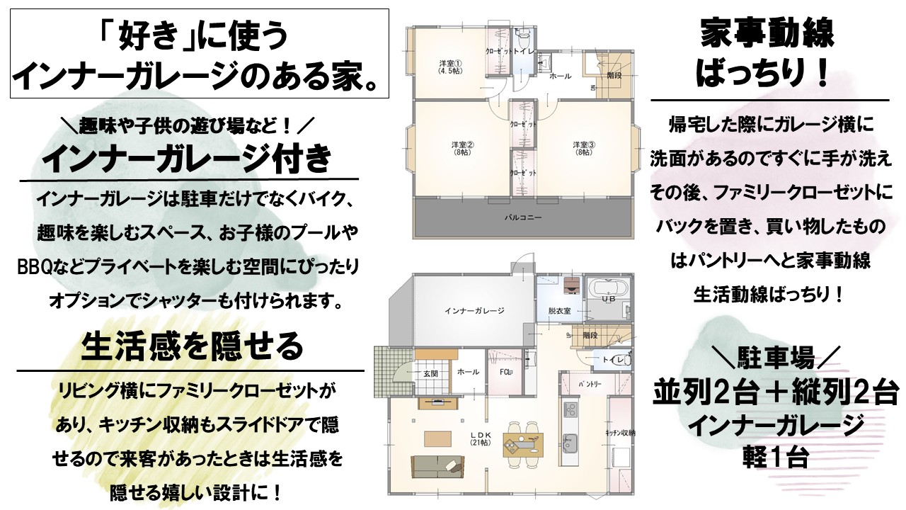 | 駐車場 | 最大5台(並列2台+縦列2台+インナーガレージ軽1台) |